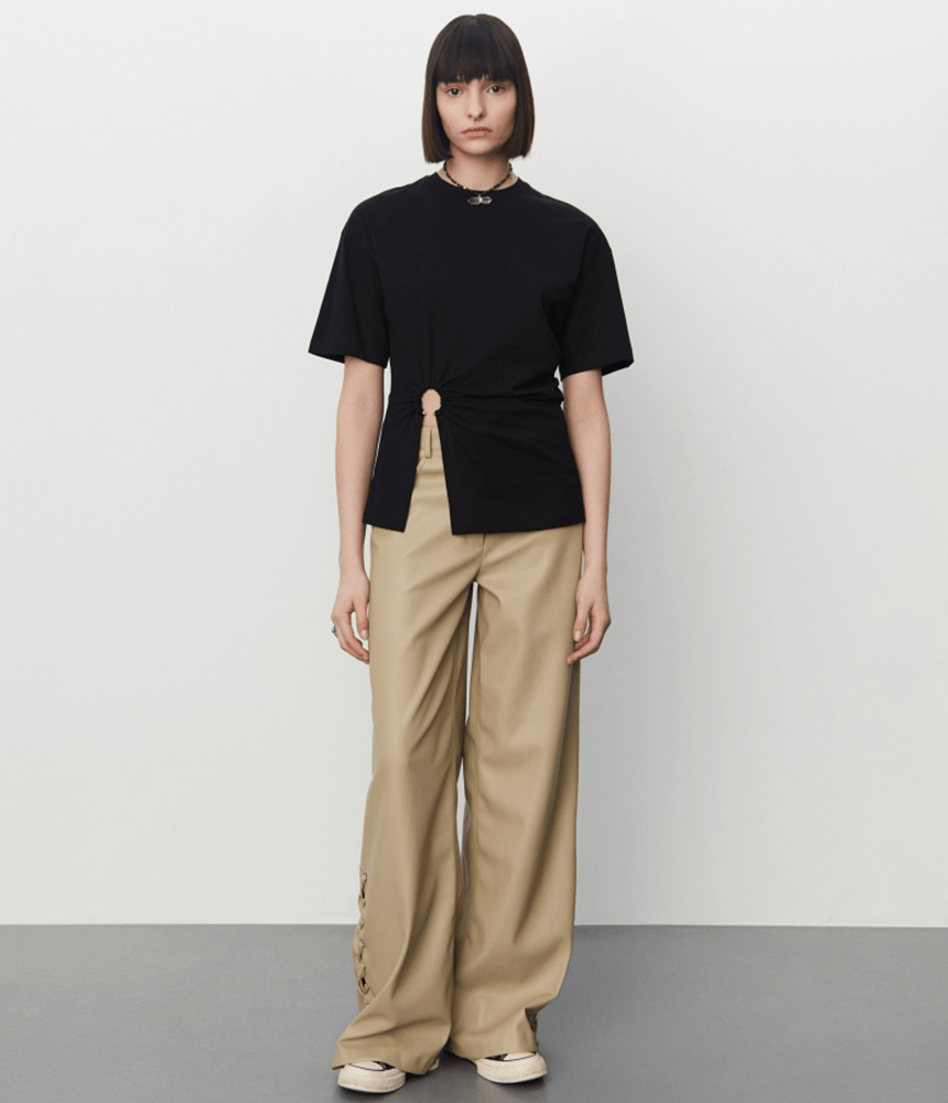 This t-shirt features an opening at the side that is gathered at the front waist with a silver hardware half-circle.