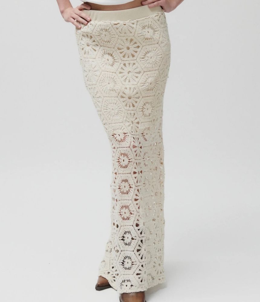Designed with a high elasticated waistband, the Austina skirt offers an easy, flattering fit that sits comfortably at the waist. An interior slip lining ensures modesty and comfort, falling to the thigh length while allowing the crochet detailing to stand out. The design is finished with a subtle back slit, giving movement and a touch of movement as you walk