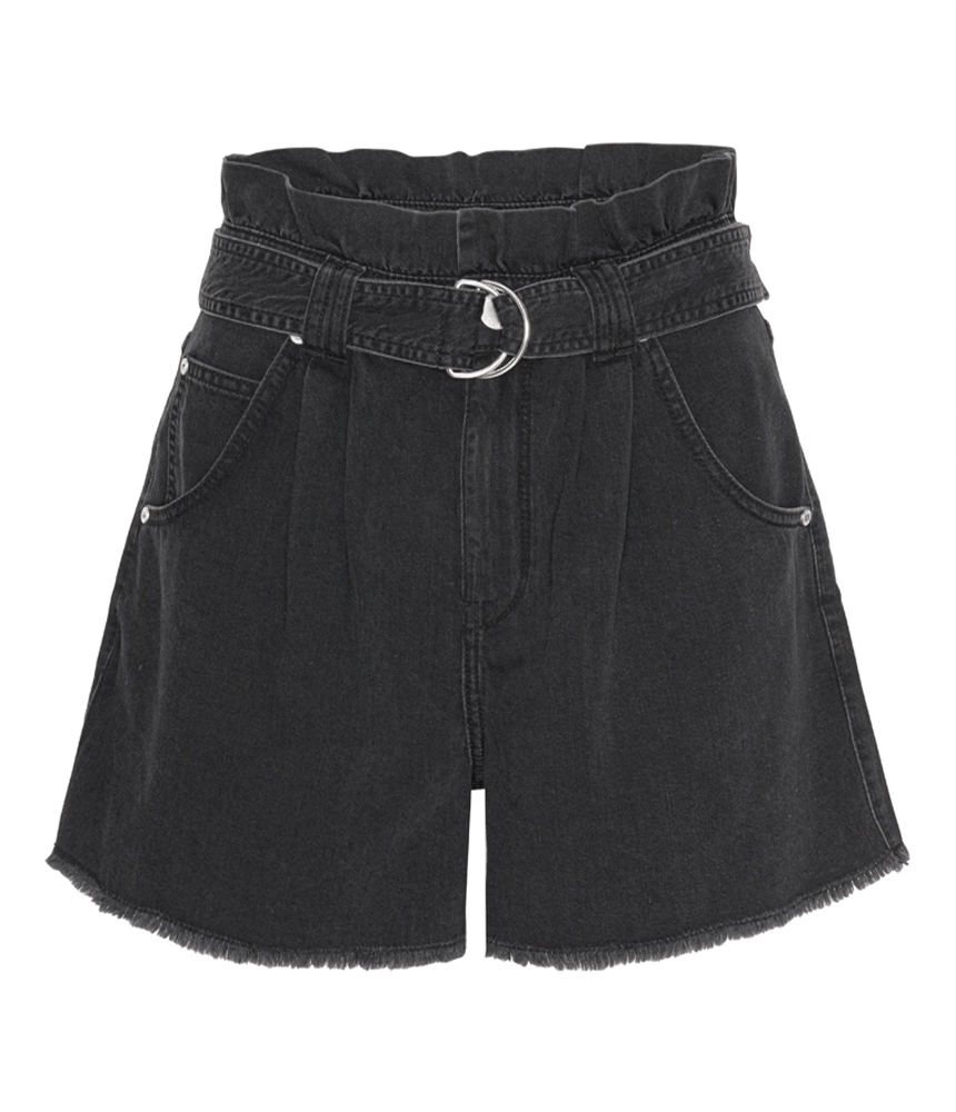 Soft, high-rise denim shorts with a paper bag waist, frayed hem, and five pockets. There is a zip fly with button closure.