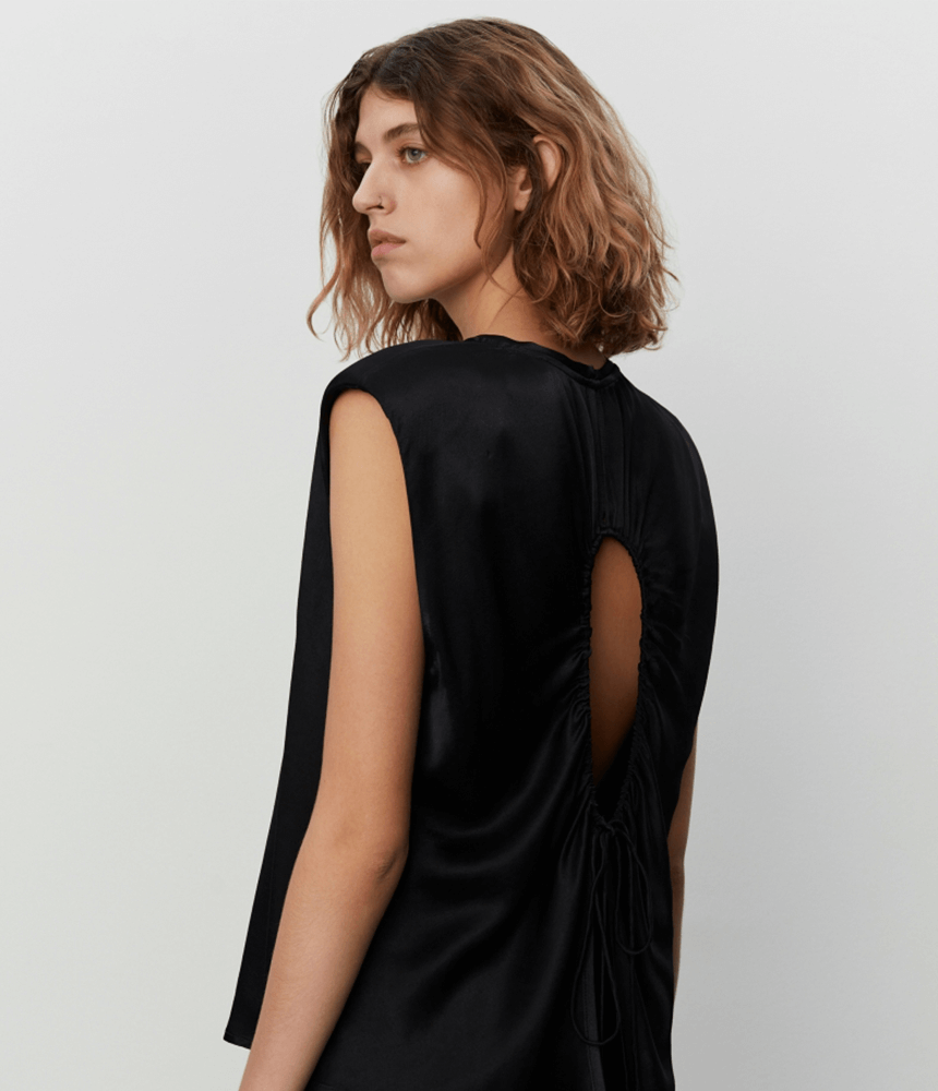 This fluid, sleeveless top features a hook closure at the back neck, a drawstring circle opening at the middle back, and padded shoulders and is a regular fit
