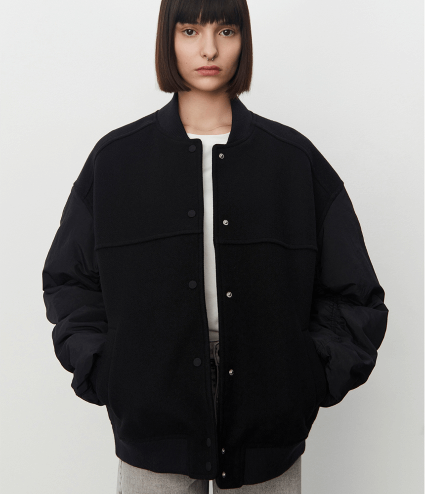 The |Cruz Bomber has an oversized fit, wool body with stud fastening and contrast shell sleeves with gathered stitching details.