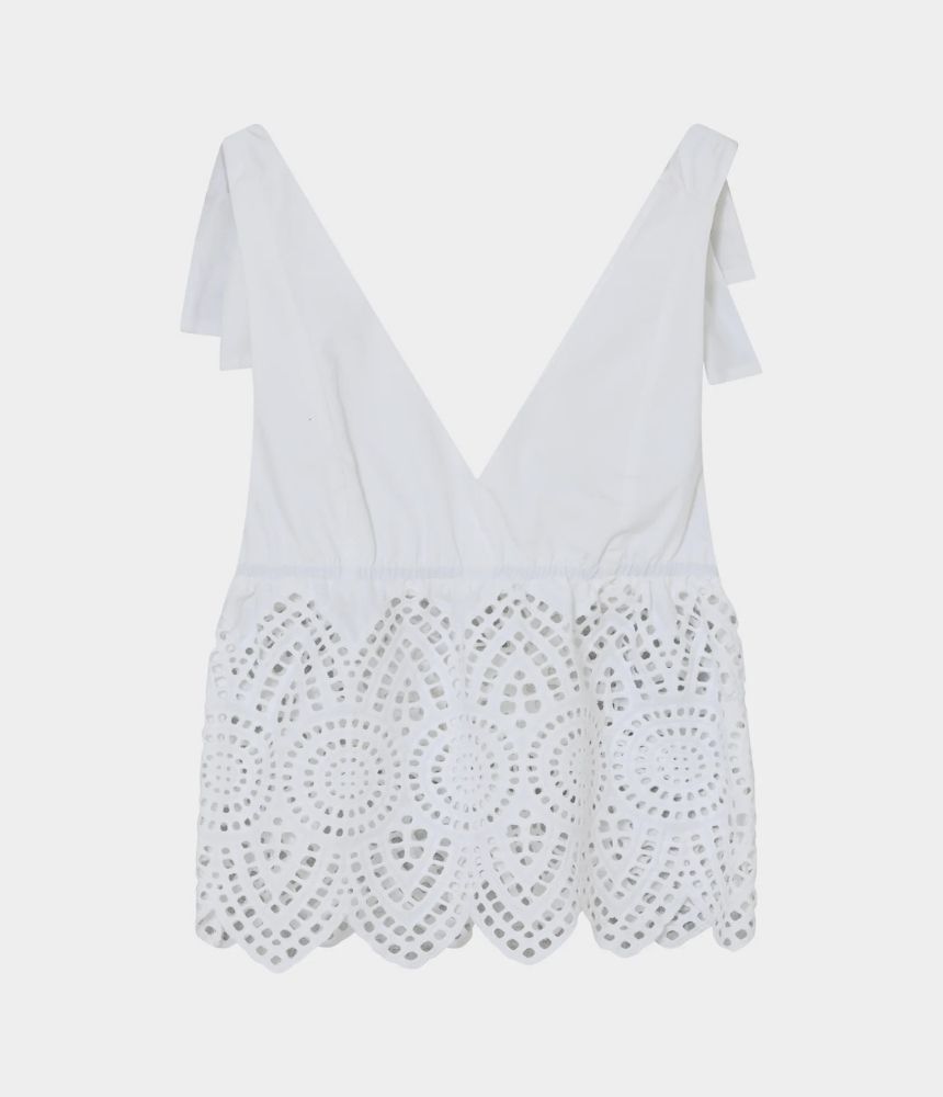 The standout details, including shoulder ties and a flattering deep V-shape neckline at both the front and back give this piece a playful, elegant silhouette that pairs beautifully with denim, linen trousers, or tailored shorts. A semi-sheer crochet panel through the torso adds subtle texture and visual interest without overpowering the crisp white hue.
