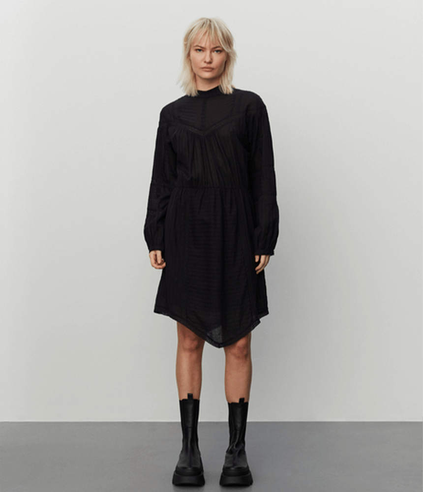 The “2nd Day Melisandra Dress in Jet Stream” is a sleek and stylish dress that is perfect for any occasion. The dress is made from a soft and lightweight fabric in a black colour-way, easy to wear and super comfortable. The dress features a flattering silhouette with a high neck and long sleeves, making it a versatile option for both casual and formal events.