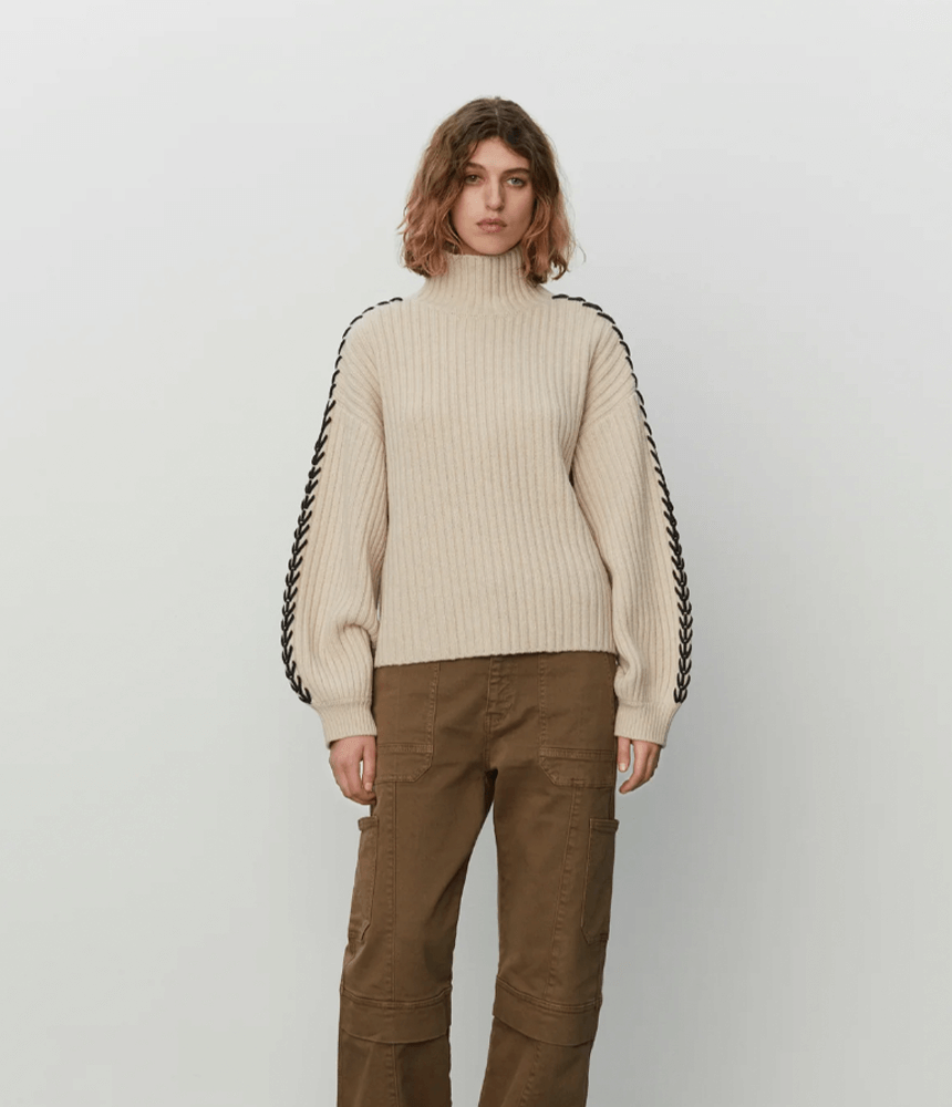 This thick, ribbed turtleneck jumper features contrasting cross stitches at the sides.