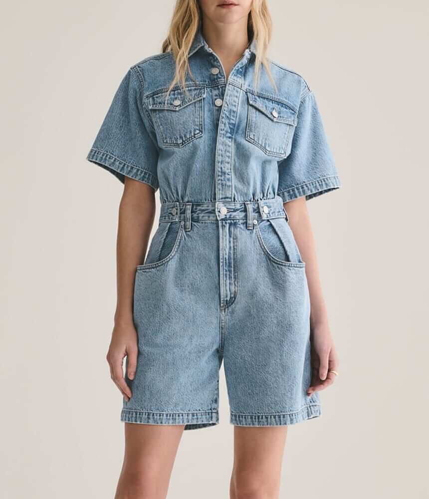 Agoldes Rio Zora jumpsuit is washed and faded to emulate vintage styles. It has a fitted waist and Bermuda-style shorts with exaggerated pockets. The premium quality denim is accented with subtle fading to provide an all-in-one step in and go wardrobe addition that will fast become your go-to piece this season.