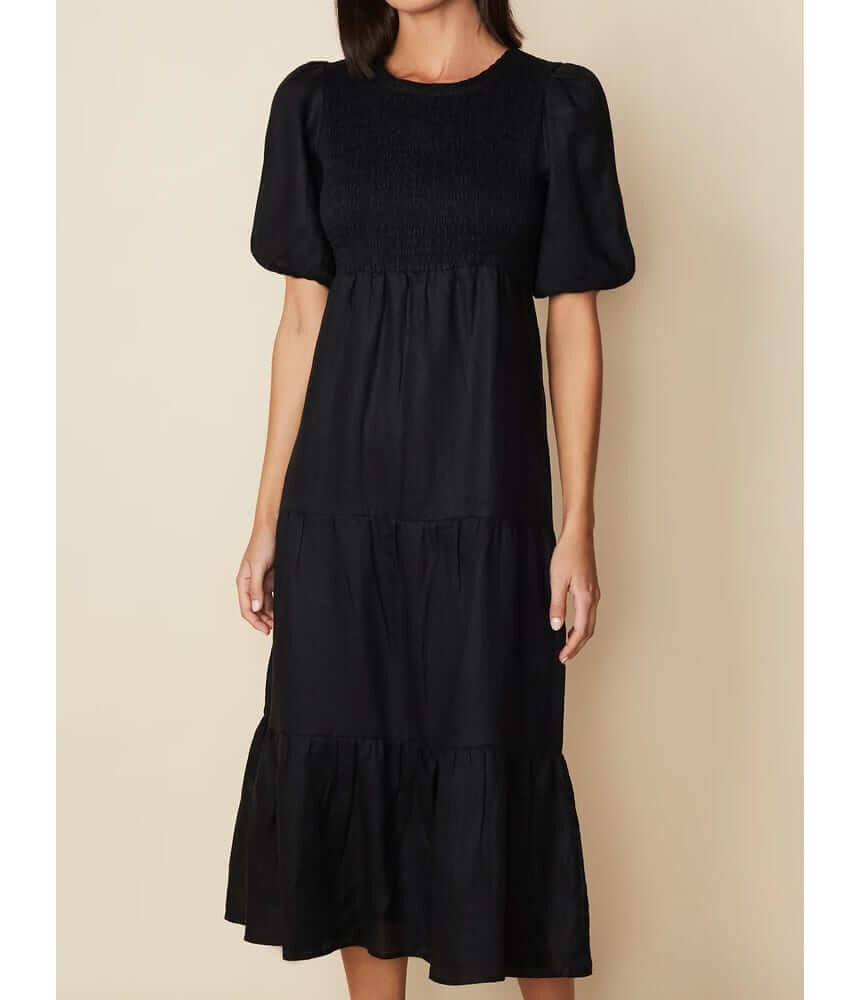 The Alberte midi dress in plain black linen is a call out style from the Le Desert Collection. Featuring a high scoop neckline, shirred bust, voluminous puff sleeves, a beautiful bra-friendly back cut out detail and a free-flowing tiered skirt. Simply add a sandal or slides, grab your straw bag and you are beach bar ready.