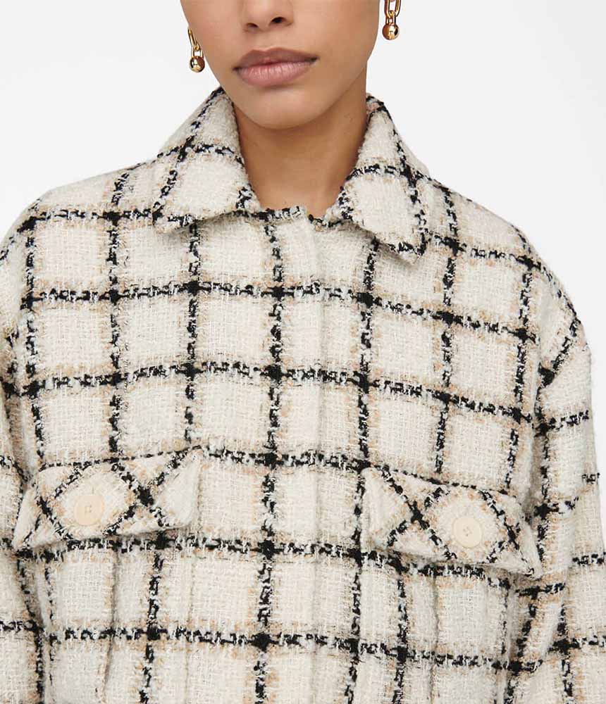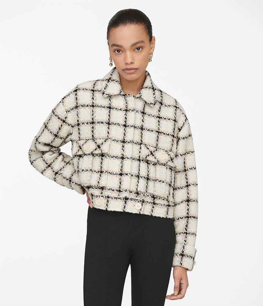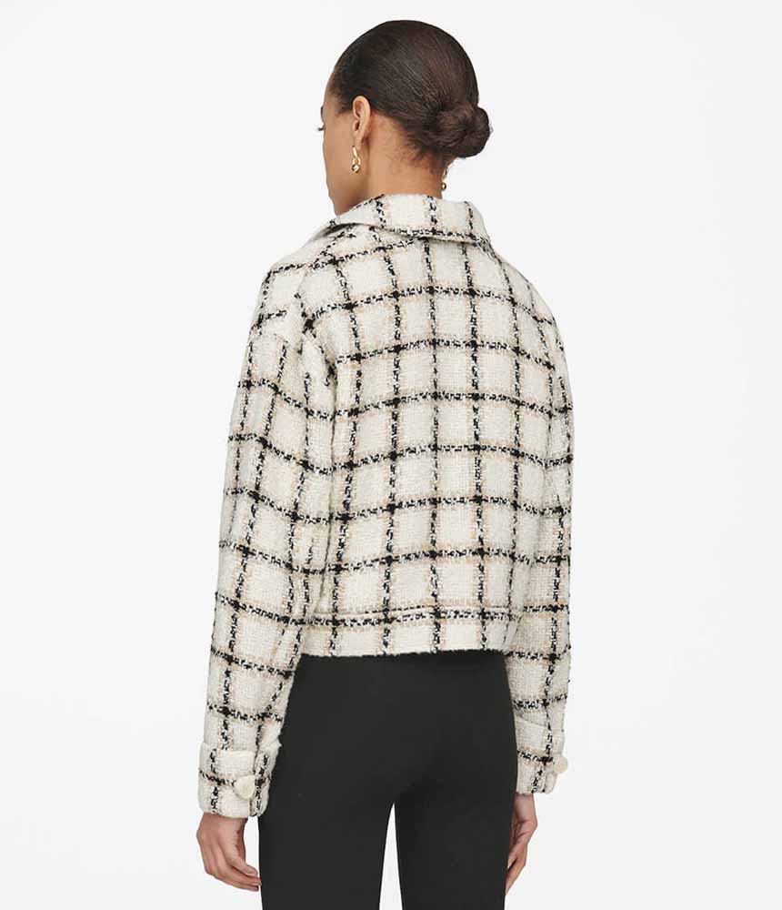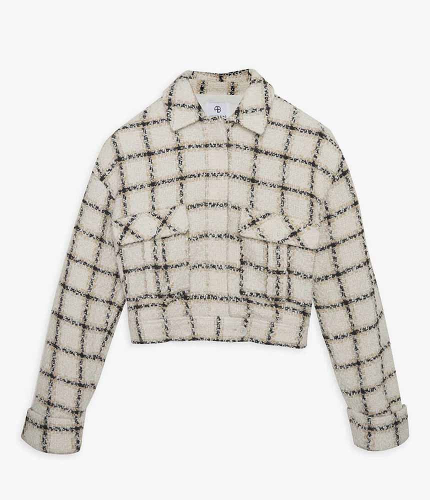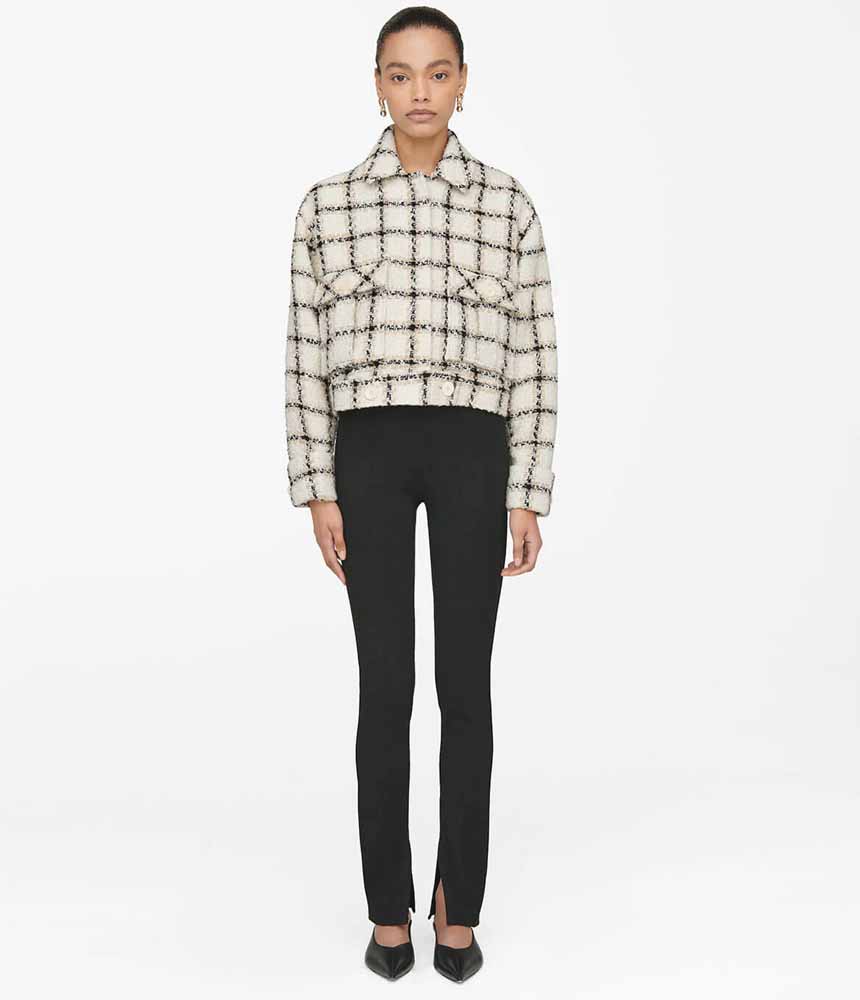 The Adriana Jacket by Anine Bing is the perfect transitional layer. Made from a neutral textured wool blend in beige windowpane plaid. and finished with ANINE BING branded buttons. This bold statement piece features two oversized flap pockets at the chest and a double-button closure at its cropped waistband, infusing crisp, tailored structure into any look. Pair with the matching Becky Shorts for a look that will take you from the office to the evening with ease.