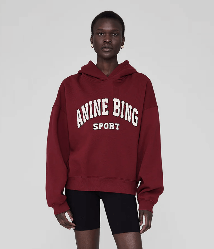 The Alec Hoodie Sport is an off-duty essential made from midweight cotton fleece in a deep red wash. It features an ANINE BING Sport chenille patch graphic in ivory collegiate lettering with black embroidery across the front.