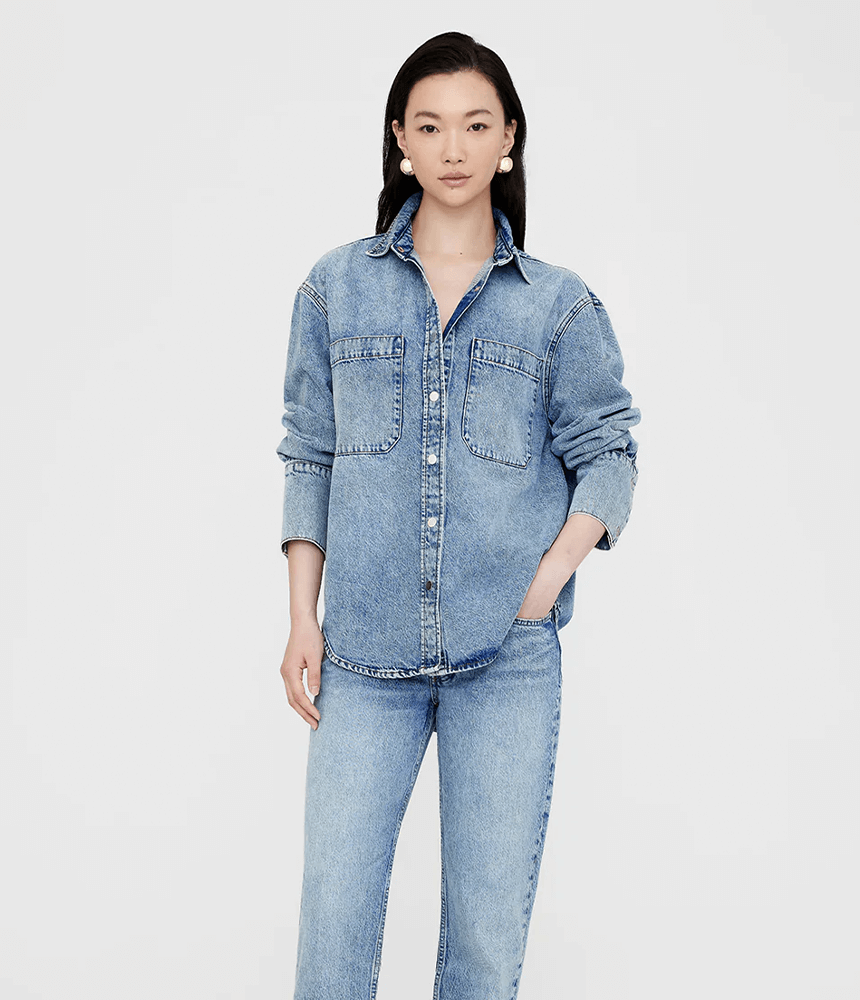 The oversized Dante Shirt is constructed from a lightweight organic-cotton blend with a slight drape in a vintage blue wash. This uniform essential features large front patch pockets, snap buttons down the center-front placket, and wide cuffs.