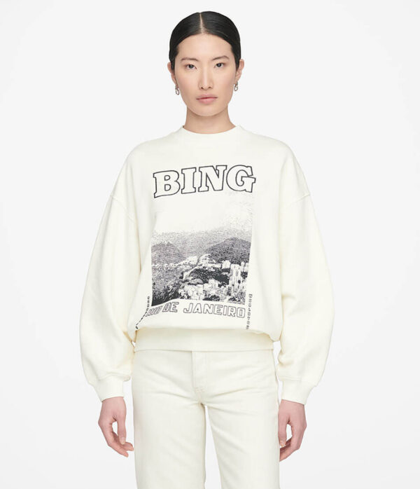 The all-new Jaci Sweatshirt is an oversized crew-neck pullover made from lightweight 100% organic cotton in cream. This relaxed-fit sweatshirt features a picturesque Brazilian coast and BING graphic screen printed with a slightly raised, puffed appearance across the front. Cut to a slightly cropped, oversized fit the sweatshirt is framed with exaggerated dropped shoulders and balloon sleeves for a casual, comfy style. Pair with distressed denim and a pair of kick-ass boots to add some serious attitude to your look.