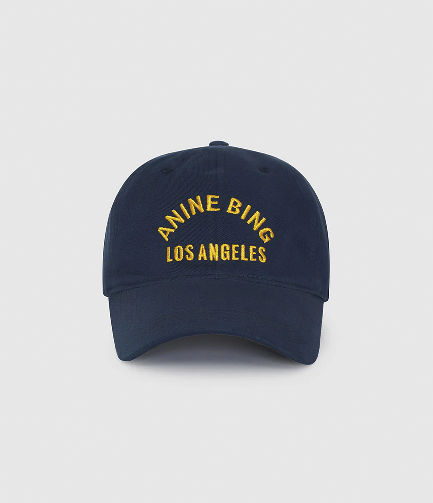 The Jeremy Baseball Cap LA is an adjustable cotton-twill hat in washed navy. It features gold satin stitch embroidery at the centre front and an adjustable back strap for a close, comfortable fit.
