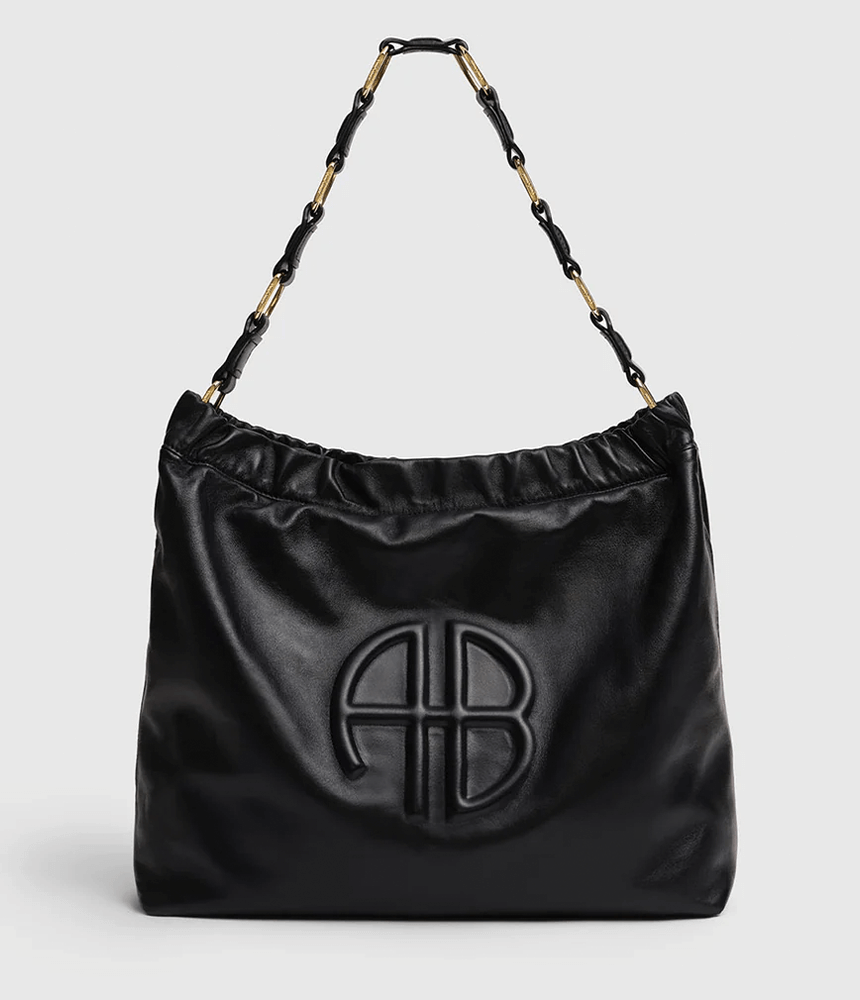 Inspired by the iconic Kate Tote, the Kate shoulder bag is constructed from smooth 100% lamb leather in black with a slight sheen. This iconic silhouette features a strap made of interlocked signature links in gold-tone hardware. Its nostalgic construction includes a ruched elastic opening and top-zip closure to reveal a fully lined cotton-twill interior with a slip pocket and zipper pocket. Finished with an embossed ANINE BING monogram at the front.
