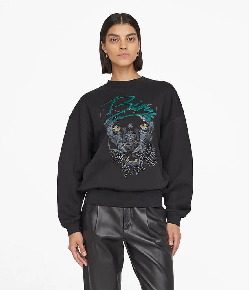 The Kenny Sweatshirt Panther is a crewneck pullover made from heavyweight 100% cotton fleece in a worn-in vintage black wash, finished with a ribbed trim along its neckline, cuffs, and hem. This style offers an update to the brand’s iconic tiger graphic with a screen printed ’80s-inspired panther accompanied by emerald green lettering embroidered on the front and back. The Kenny Sweatshirt is cut for an oversized fit that’s slightly more relaxed than the Evan Sweatshirt from ANINE BING Sport. Take your true size. Please note: that his item is handcrafted and will vary in colour or appearance. Style with dark denim, chunky boots and an oversized trench coat for a contemporary and cool winter vibe.