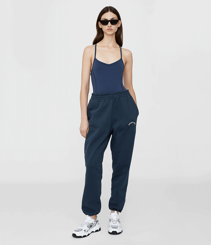 The Leone Jogger is an oversized sweatpant made from midweight 100% cotton fleece in navy. This style features white satin stitch embroidery at the wearer’s left thigh, side seam pockets, an elasticated drawstring waistband, and inner bungee cording at the leg openings for a fully adjustable fit. Pair the Leone Jogger ANINE BING with the matching Lucy Hoodie to complete the look.