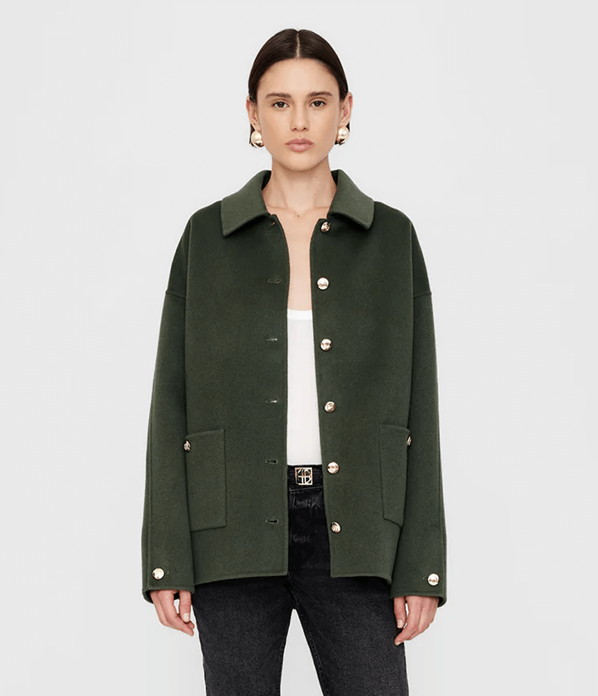 The Luca Jacket is made from our signature double-faced wool-cashmere fabrication in olive. This luxurious, everyday layer is unlined and features two patch pockets at the hips, dropped armholes, and side slits for effortless layering. Gold buttons with ANINE BING engraving decorate the centre-front placket for an elevated look.