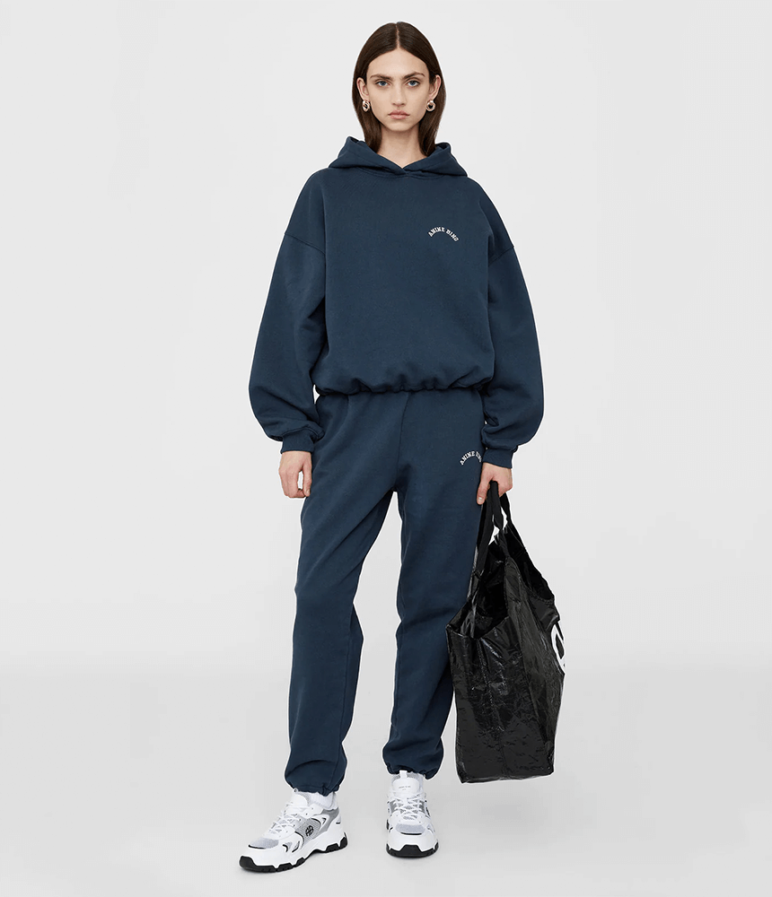 The Lucy Hoodie is an elevated casual made from midweight 100% cotton fleece in navy. It features an graphic embroidered in contrast white at the wearer’s left chest and inner bungee cording at the hem for an adjustable fit.