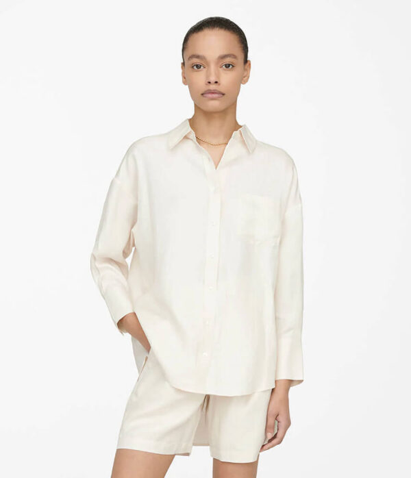 The best-selling Mika Shirt from the Classics Collection updated in a lightweight ivory linen blend. Its oversized silhouette features dropped shoulder seams and back pleats for added shape. Finished with an exaggerated shirttail hem and bracelet-length sleeves secured by double-button detailing at each cuff. Pair with light-wash jeans and black boots for an effortless look.