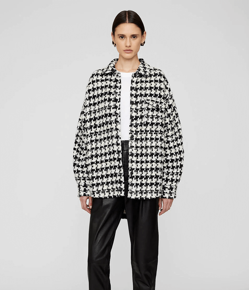 Inspired by the Sloan Shirt, the Sloan Jacket is made from a heavyweight abstract tweed fabrication with hints of metallic woven throughout. This relaxed wardrobe staple features an exaggerated shirttail hem, dropped shoulder seams, fully lined long sleeves, and back pleats for added shape. Finished with a single patch pocket at the wearer’s left chest.