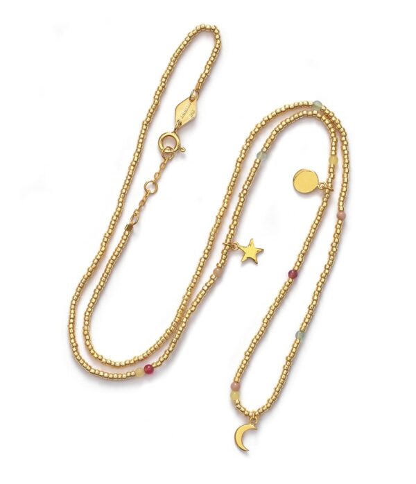 Jump into Summer with this beautiful 3-in-1 piece. Wear it as a necklace. Double as an anklet or triple as a bracelet. Made with seed beads and a mix of semi-precious gemstones. Detailed with sun, moon and star charms; to indicate glory. Perfect for your everyday layering!