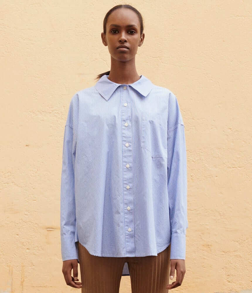 This ultra-versatile shirt by Samsoe Samsoe is crafted in a crisp pure Organic Cotton cloth with a woven stripe. Cut in a relaxed loose fit with a round collar and shaped long sleeves. This classic piece can be styled up or down effortlessly and carry you through all seasons.