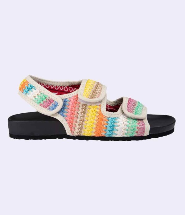 The Apache sandal from Arizona Love is a new silhouette for the brand, taking on more of a full-coverage shape and is cast in multicoloured woven Raffia. The multicoloured stripe design in woven raffia is bold and screams summer whilst maintaining a high level of comfort from the extra-wide straps and moulded footbed. This sandal is perfect for beach days, style with a colourful summery dress. Handmade and handcrafted.