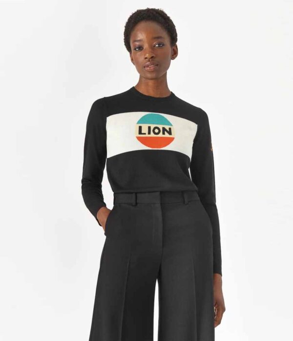 This beautiful 100% Pure Merino knitted wool jumper by Bella Freud is fully fashioned with ribbed crew neck, hem and cuffs. It features the classic ‘Lion’ emblem with stripe across the chest and an orange ‘JAH’ intarsia on the sleeve. We would style with our exclusive 50 Pieces Lucy leather mini skirt and a cute ankle boot for a winning look.