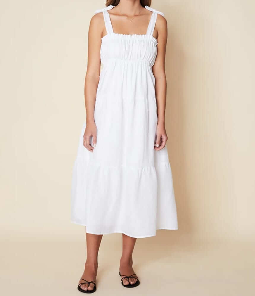 The Bellamy Midi Dress in classic white is a classic, longline, tiered sundress designed to be worn for seasons to come. Featuring an elasticated bust area and wide, adjustable over the shoulder straps. We love to pair this back with a pair of neutrally toned sandals.