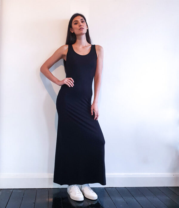 Black White Denim’s Maxi Dress with figure flattering fit will take you from day to night in any season. This neatly cut piece is a sleek foundation for any basic wardrobe and is cut from the softest knitted fabric with beautiful drape. Style this wardrobe work-horse up or down with ease for years to come.