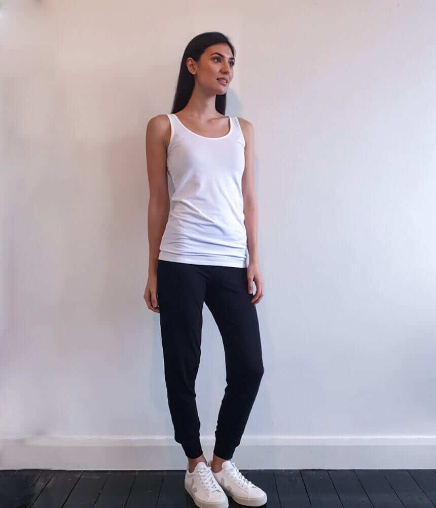 A well-edited wardrobe requires basics you can depend on and Black White Denim’s Vest is the perfect pick. This longer-length piece with a flattering scoop neckline is cut in the softest cotton and modal-blend jersey. Style this easy-to-wear vest alone or as a chic layering piece. Also available in grey marl and black.