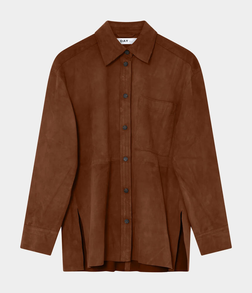 This suede button-up shirt features snap button closures and a patch pocket on the front. There are slits at the sides. The shirt is unlined and has an oversized fit.
