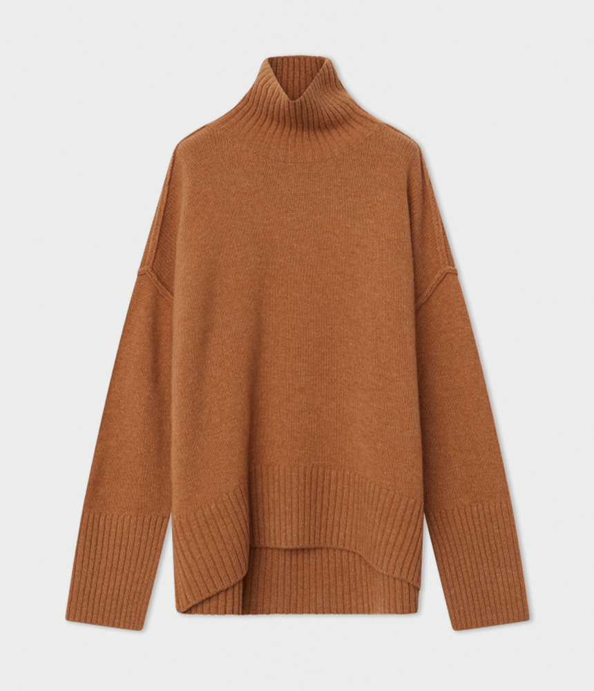 This soft, thick turtleneck jumper features ribbing at the neck, hem, and wrists. It has a dipped hem and an oversized fit.