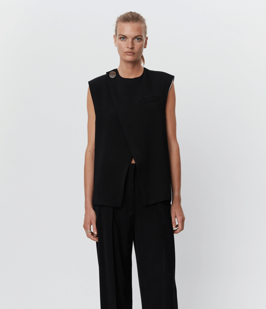 This classic black waistcoat is a go-to essential that will “shrink your wardrobe” by being a versatile piece that can be styled in multiple ways. It’s a timeless investment that you can “buy now keep forever.”