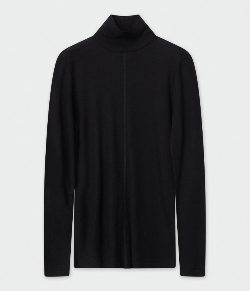 This thin, knit turtleneck top features a raised seam in the middle. The top has a slim fit.