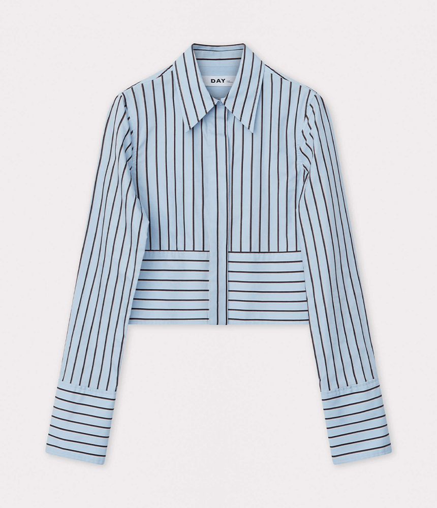 This crisp button-up shirt features oversized cuffs, and a hidden button placket. The shirt has a regular fit and a cropped length.