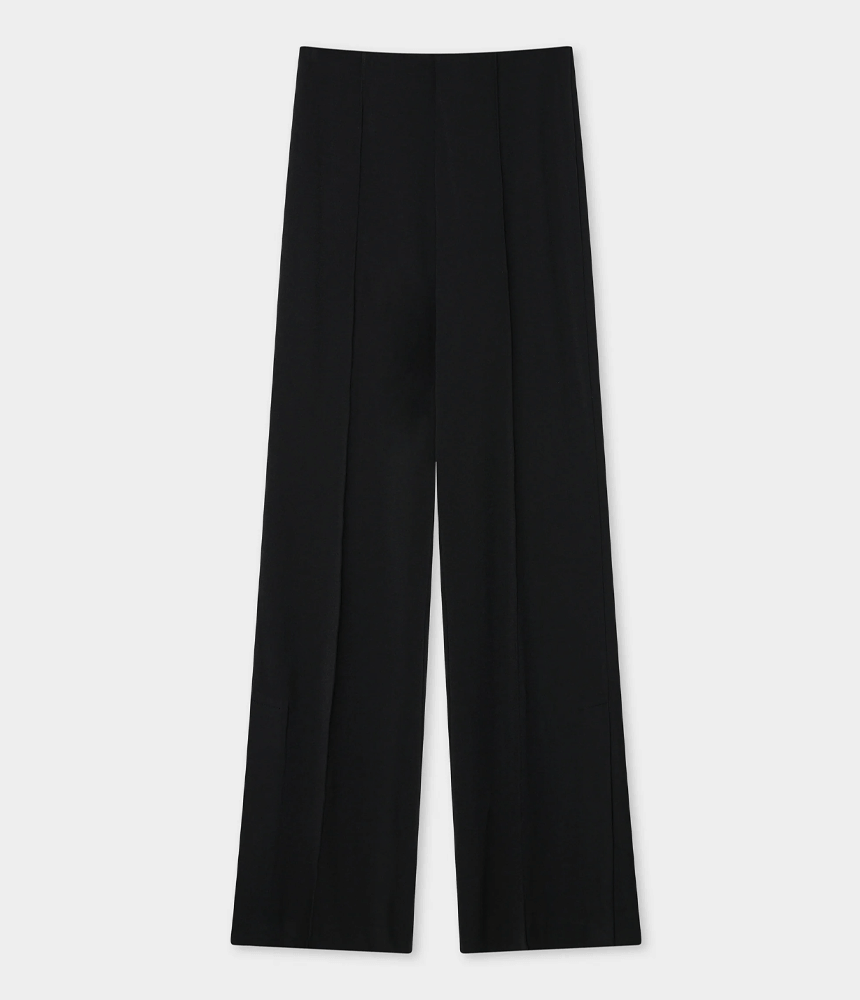 These high-rise, stretchy wide-leg trousers have an elasticated waistband and raised seams. There are slits at the ankles. These trousers have a regular fit.