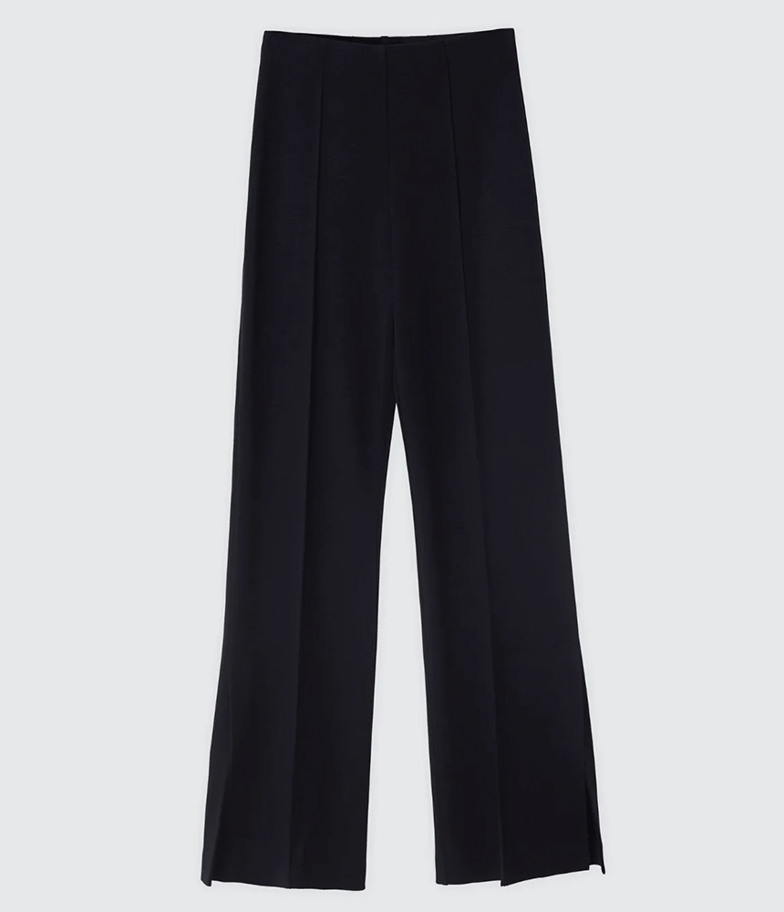 These high-rise, stretchy trousers have a flared leg with slits at the sides. They have an elasticated waist and pressed pleat down the front. Pair with a crisp button-up shirt for a comfortable yet professional look.