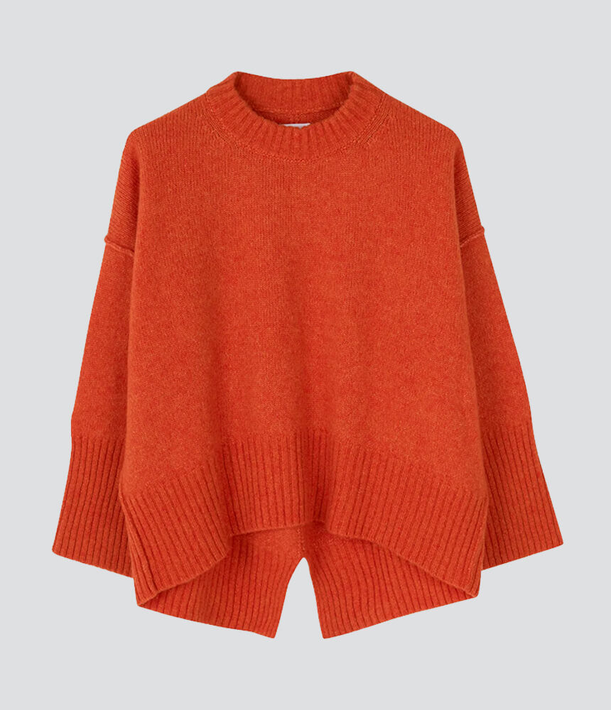 A boxy-cut crew-neck jumper with a dipped hem, raised seams, and ribbing at the neck, wrists, and hem. Wear it over a collared shirt and tailored trousers for a classic, professional look or throw over a pair of jeans for something a little more casual.
