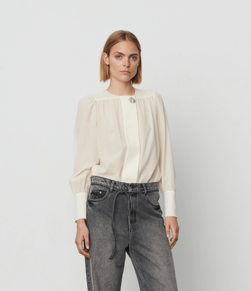 This crisp, loose-fitting blouse features hidden buttons down the front, a large bauble at the neck, and smaller baubles at the cuffs. There is slight puffing at the shoulders and a dipped hem. Wear tucked into high-rise trousers for a chic outfit.