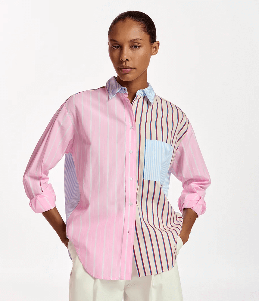Cut from panels with differently coloured striped designs, this cotton-poplin shirt brings a fun update to the timeless wardrobe staple. The oversized silhouette is finished with a rounded hemline that is longer at the back and turns to reveal an extra row of buttons. It’s a statement piece that encourages you to “make it yours” by styling it in your own distinctive way. Whether paired with black or white denim, this shirt effortlessly elevates any look, making it a go-to classic in your wardrobe.