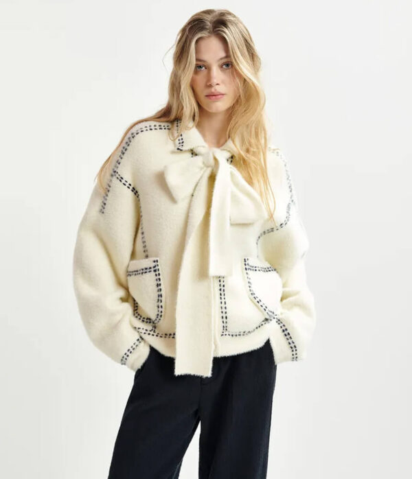 Spun from a plush thread for a sumptuous handle, this knit features contrasting stitching that enhances the oversized silhouette. With two patch pockets, the coordinating self-fabric scarf adds charm to a modern finish.