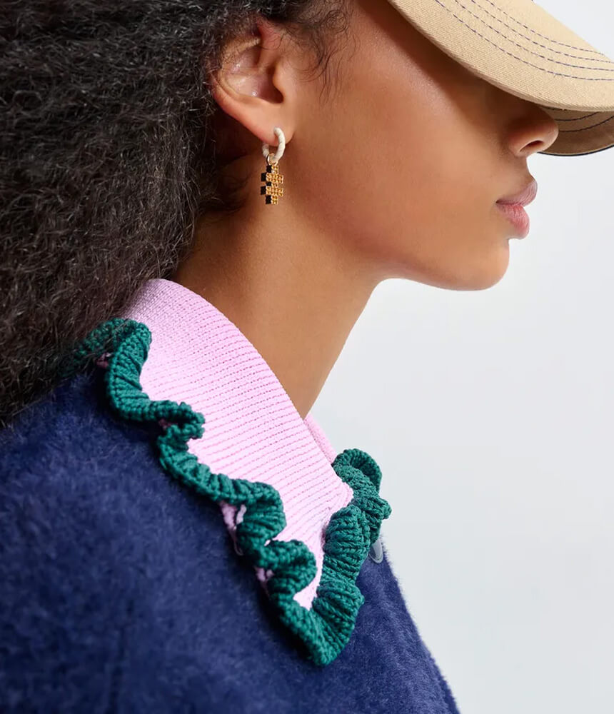 Cardigan in a tactile finish, designed with a button-front closure and two patch pockets. The look is defined by a contrasting color knit collar, accented with a colorful ruffle border for added definition and texture.