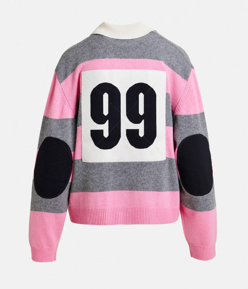 Fine-knit sweater is crafted from a soft wool-cashmere blend and designed for a relaxed fit with dropped shoulders. It features a button fastening, ribbed trims, and reinforced elbow patches. An applicated ’99’ patch on the back completes the design.