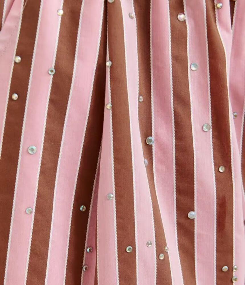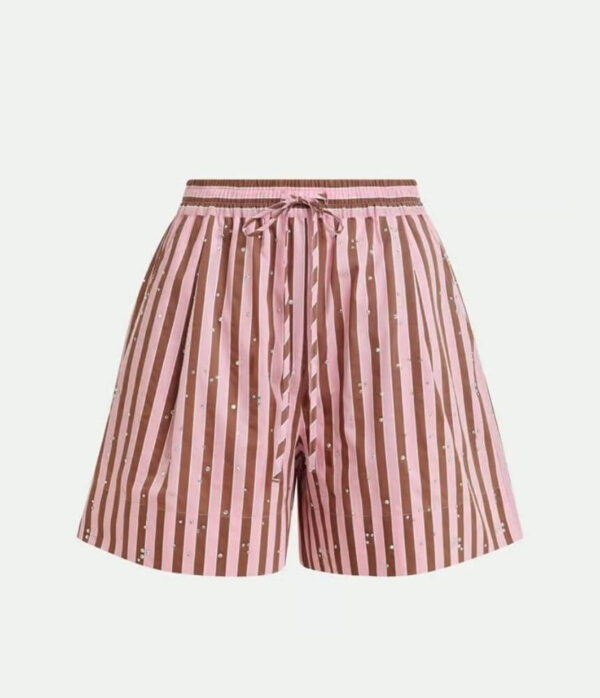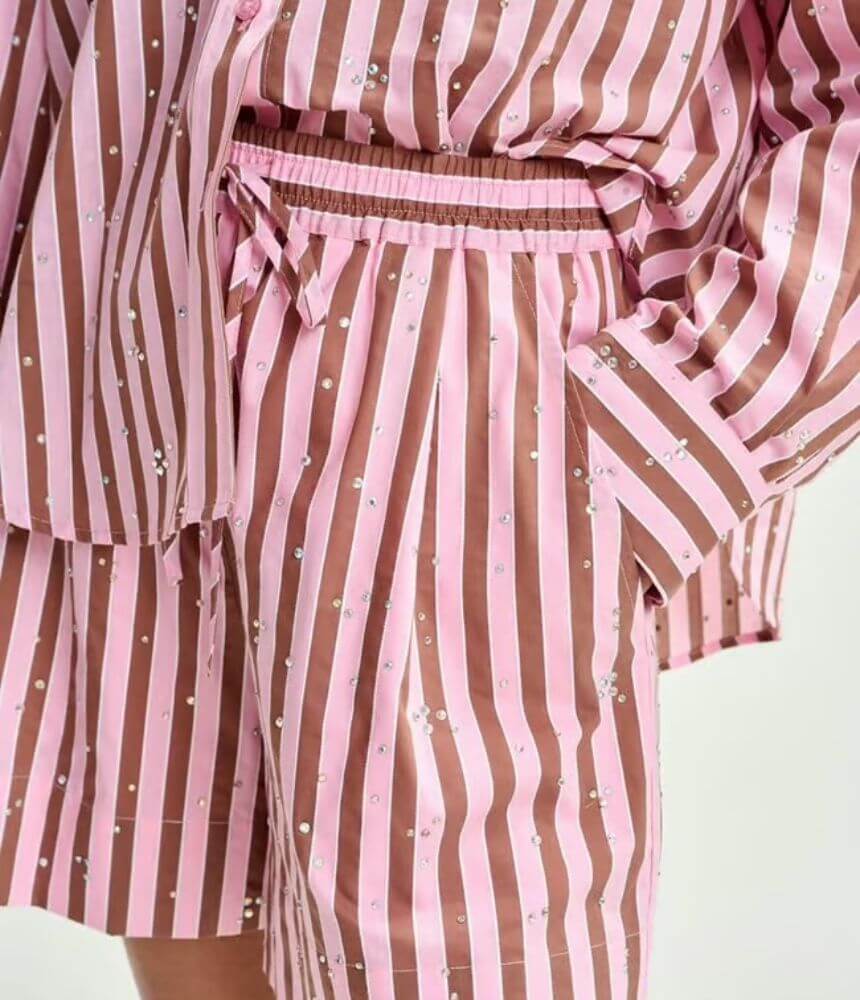Striped shorts are beautifully accented with delicate rhinestone embellishments. Crafted from a cotton-blend, they feature a high-rise design and a relaxed fit, complete with an elasticated waistband and drawstring fastening for all-day comfort. Inverted pleat details at the waist add subtle structure, while slanted pockets bring a touch of practicality.