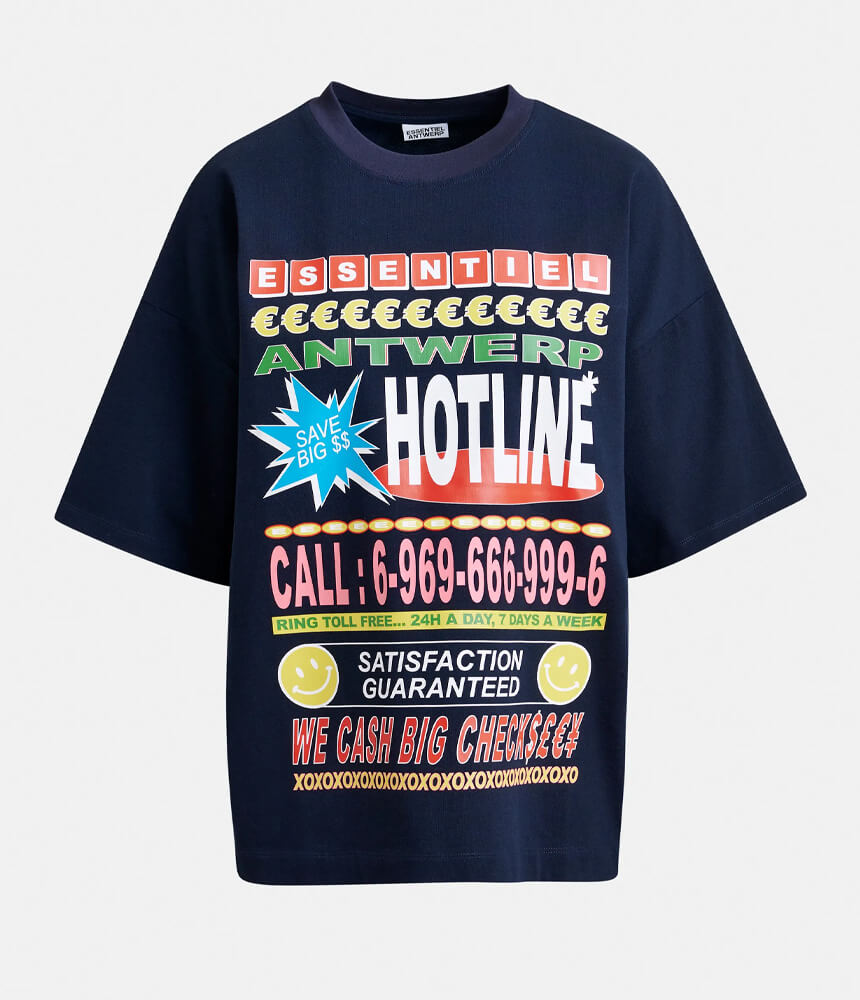 Oversized T-shirt crafted from 100% cotton and detailed with an eclectic mix of vibrant prints across the front, combining playful text, hotline references, and colorful graphic elements for a bold statement look.