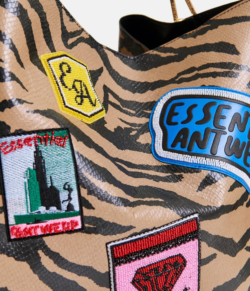 Crafted from glossy faux leather, this rectangular shopper bag features a bold tiger print and playful patch details. It includes two detachable shoulder straps—one designed to resemble the bag and the other a belt—offering versatile styling for handheld or hands-free wear. The lined interior has a zipped pouch and card slot to keep essentials secure, while gold hardware and logo accents complete the look.