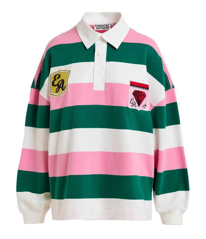 Crafted from a cotton-blend, this polo is cut for a relaxed fit with dropped shoulders. It features a classic button fastening and ribbed trims, while the front is adorned with appliquéd patches for visual interest. Double stitching throughout reinforces the garment’s construction, and a striped pattern completes the design.