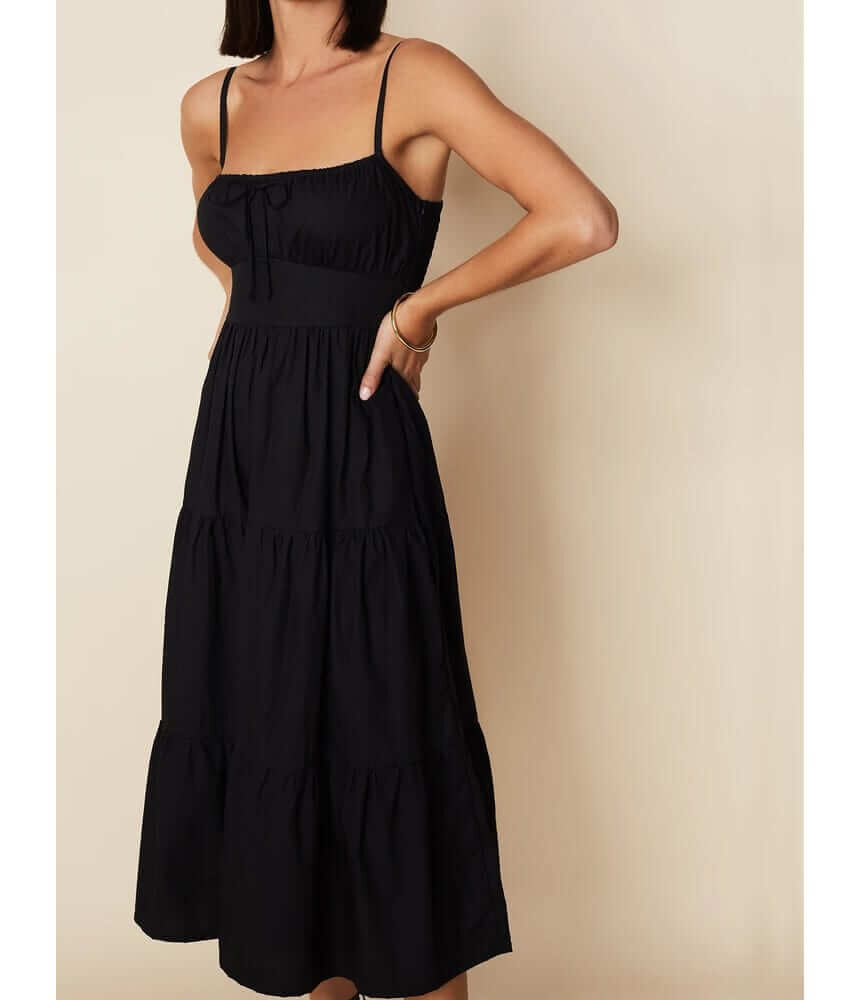 The Alexia Midi Dress, crafted in a classic black cotton poplin fabric. is the perfect feminine dress for your trans-seasonal wardrobe. Featuring an elasticated neckline, delicate shoulder straps, a fixed waistband, shirred back and a tiered silhouette. Complete the look with either your favourite flats or espadrilles to elevate your look from daytime to evening.