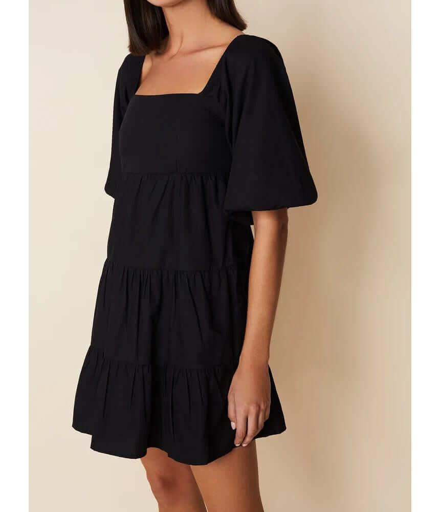 The Eryn mini dress in a classic black will fast become your go-to for the season. This ready-to-wear staple features voluminous puff sleeves, a tiered silhouette and a centre-back tie strap with a concealed side zip. Style this go anywhere dress with a black strappy sandal and a bold lip.