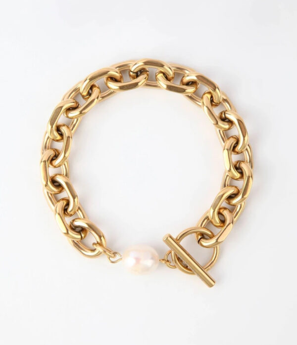 A beautiful piece of embellishment, the Olympia bracelet brings together a few of our favourite details, from chunky 80s-inspired chain links to real freshwater pearls and a T-bar closure. Layer the 18k gold-plated design with a few other bracelets, or wear it just as it is.