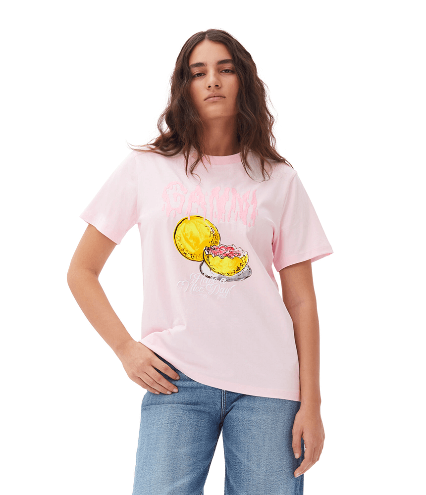 This Pink Basic Jersey Grapefruit Relaxed T-shirt features a round neckline, short sleeves and a graphic GANNI print.